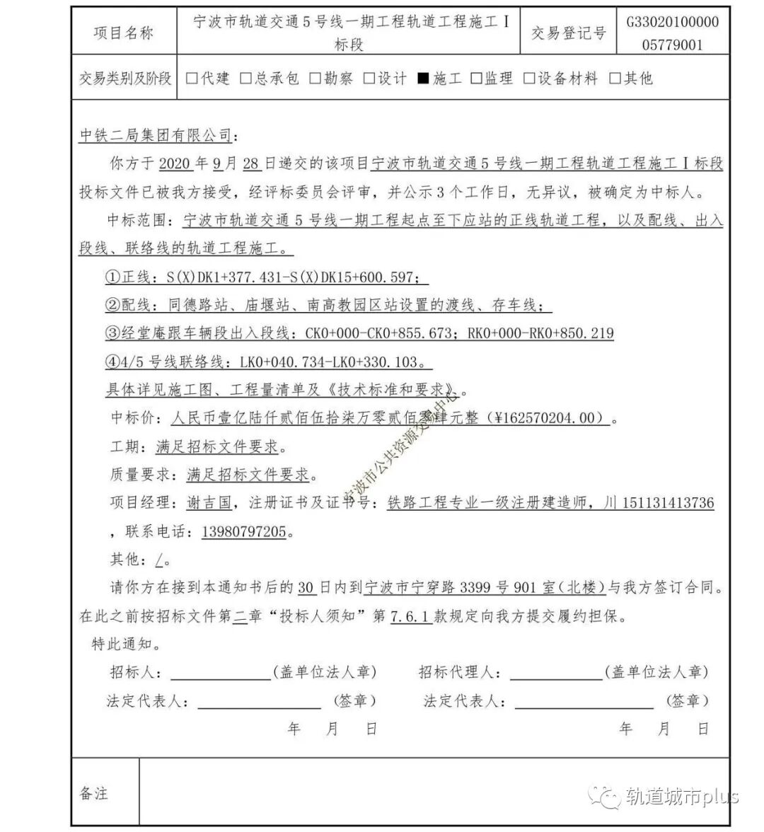 宁波市轨道交通5号线一期工程轨道工程施工002标段中标公告