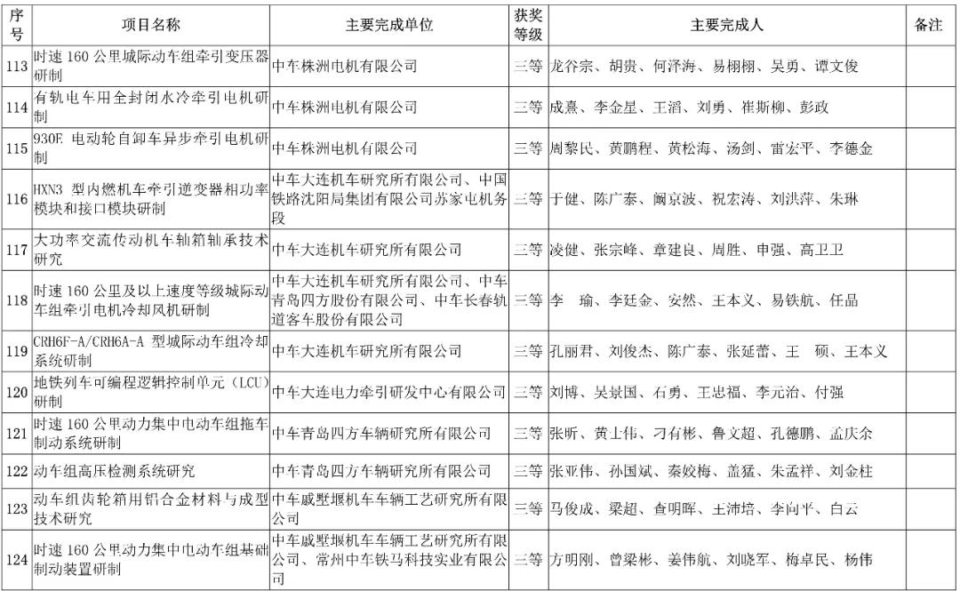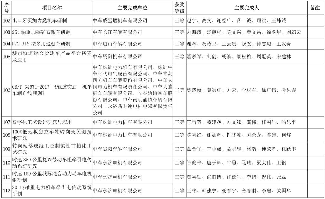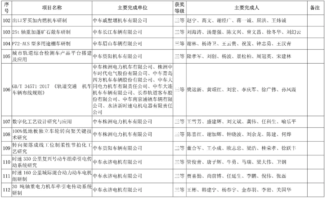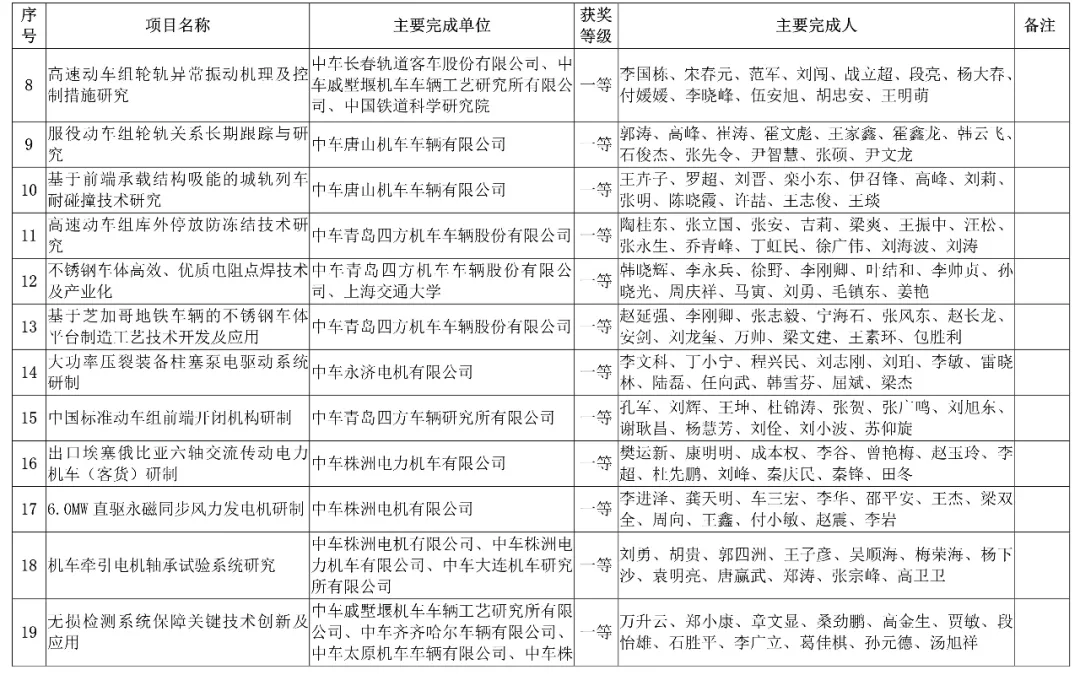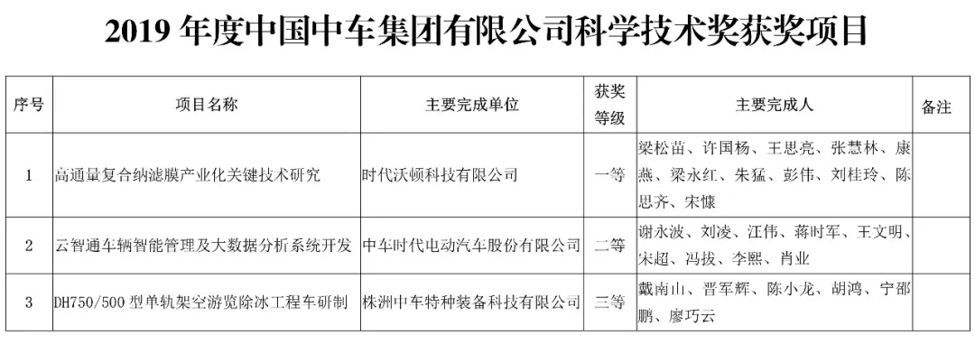中国中车集团有限公司,授予3项科技成果“2019年度中国中车集团有限公司科学技术奖”,其中一等奖1项、二等奖1项、三等奖1项。