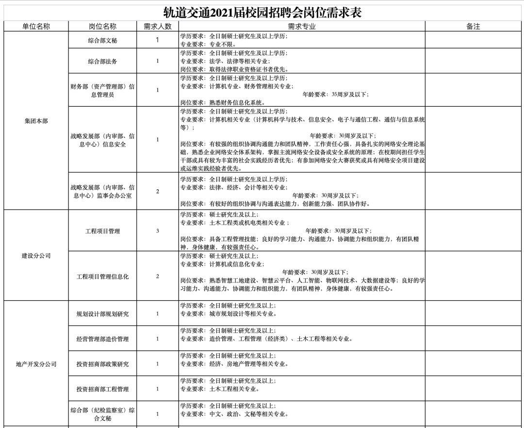 因工作需要,宁波市轨道交通集团公司参加宁波人才网2020年10月24日“我选宁波、我才甬现”宁波-成都站招聘和2020年10月31日“我选宁波、我才甬现”宁波-武汉大学招聘会(具体信息见宁波人才网)招聘2021届应届毕业生,具体岗位要求详见附表。