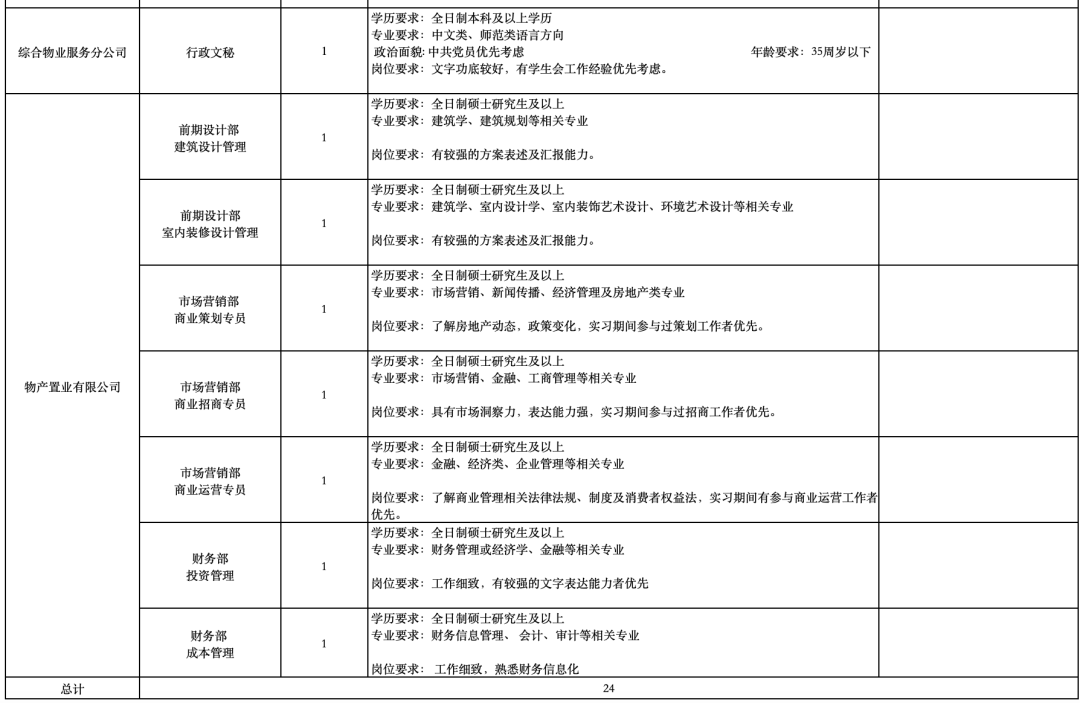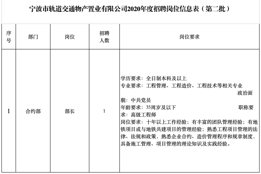 因工作需要,宁波市轨道交通物产置业有限公司特招聘以下岗位人员(详见附表)。