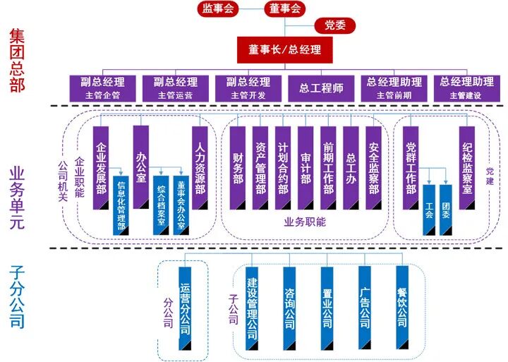 职能机构:建设事业部、合约法规部、总体规划部、投资策划部、机电事业部、人事部、财务部、办公室