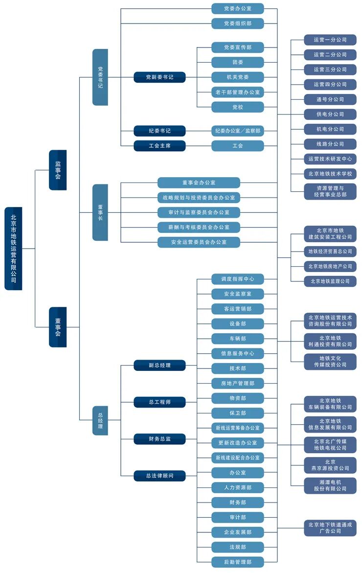 北京市地铁运营有限公司是大型国有独资企业,在职员工三万余名。所辖运营线路共计16条(其中包括1号线、2号线、5号线、6号线、7号线、8号线、9号线、10号线、13号线、15号线、八通线、机场线、房山线、昌平线、亦庄线、S1线)运营总里程521公里,运营车站314座。公司主营业务涵盖客运服务、维修服务、车辆厂修、广告、民用通信、文化传媒、商业;关联业务涵盖投融资、新线、更新改造、技术研发、咨询培训、车辆制造。
