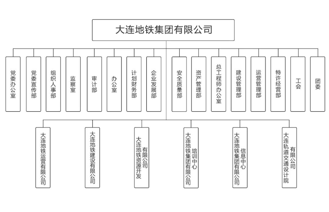 大连地铁集团成立于2017年2月16日,为市属全资国有企业。注册资本115.9亿元。下设运营公司、建设公司、资源开发公司、轨道交通设计院、培训中心和信息中心等6个分子公司,职工5612人。现有运营线路5条,车站70座,运营里程157.88公里,轨道交通车辆114列、556辆。