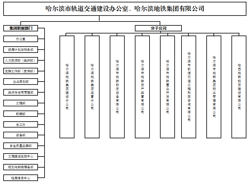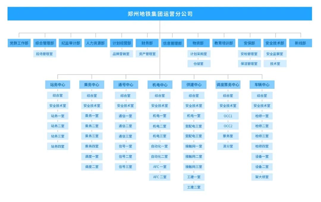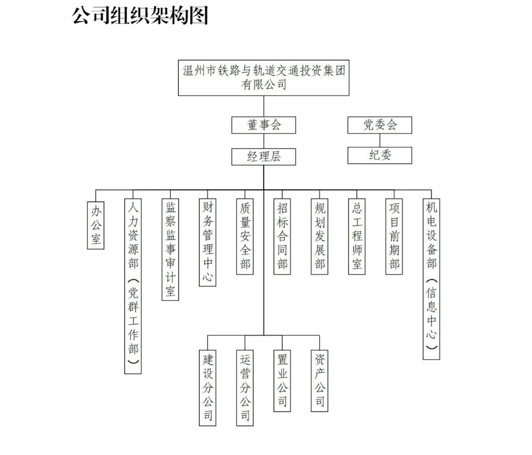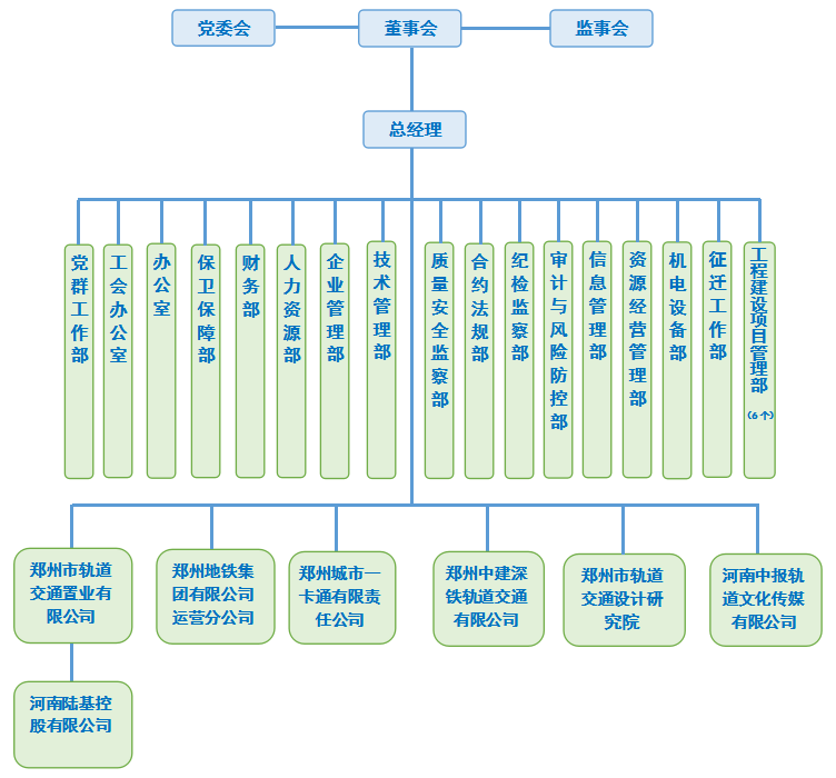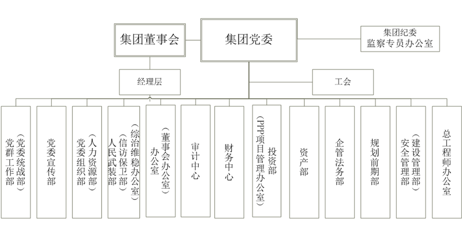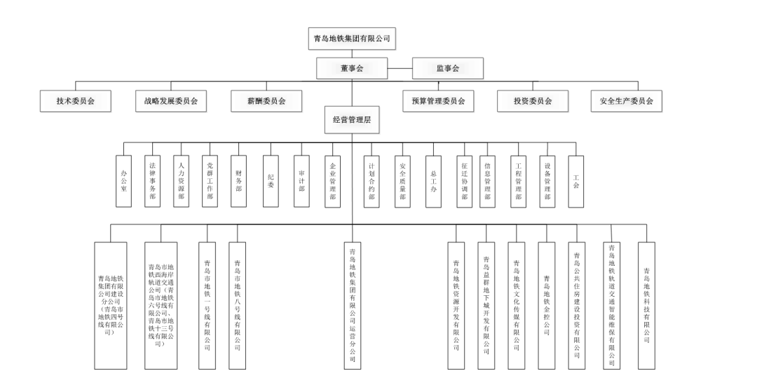 公司设置了董事会、监事会、办公室、监察室、地铁办公室、人力资源部、财务部、审计部、运营事业部、安全保卫部、企业管理部、工程部、计划部、总工办、材料供应部、设备部、工程前期工作部、总务部、工程收尾办等17个部室。