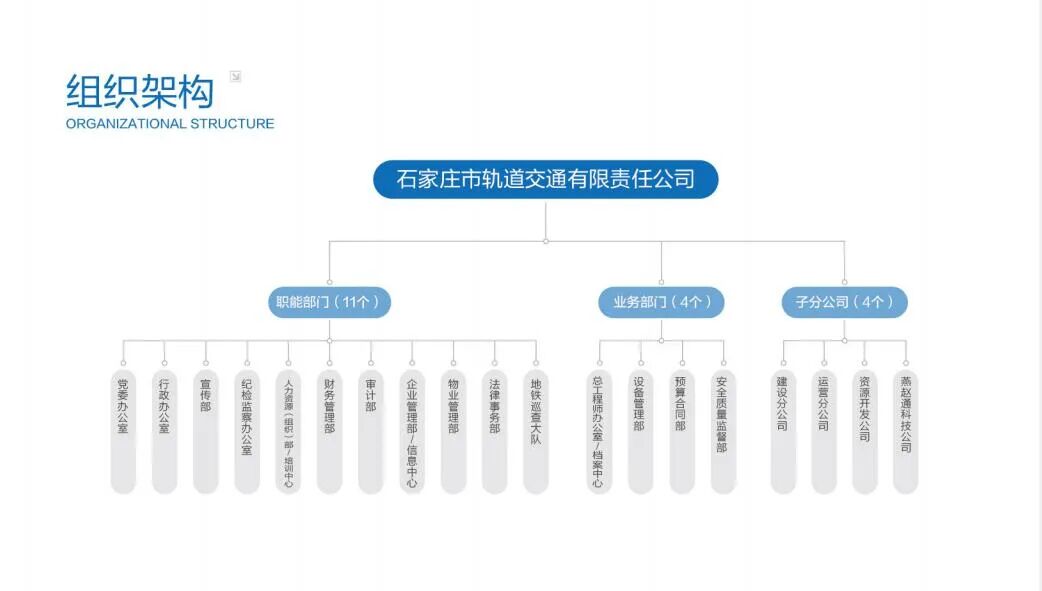 石家庄市轨道交通有限责任公司(以下简称公司)是石家庄市乃至河北省唯一一家从事轨道交通建设及运营管理的公司。公司成立于2010年4月14日,公司主要承担石家庄市轨道交通项目建设和地铁运营管理工作。