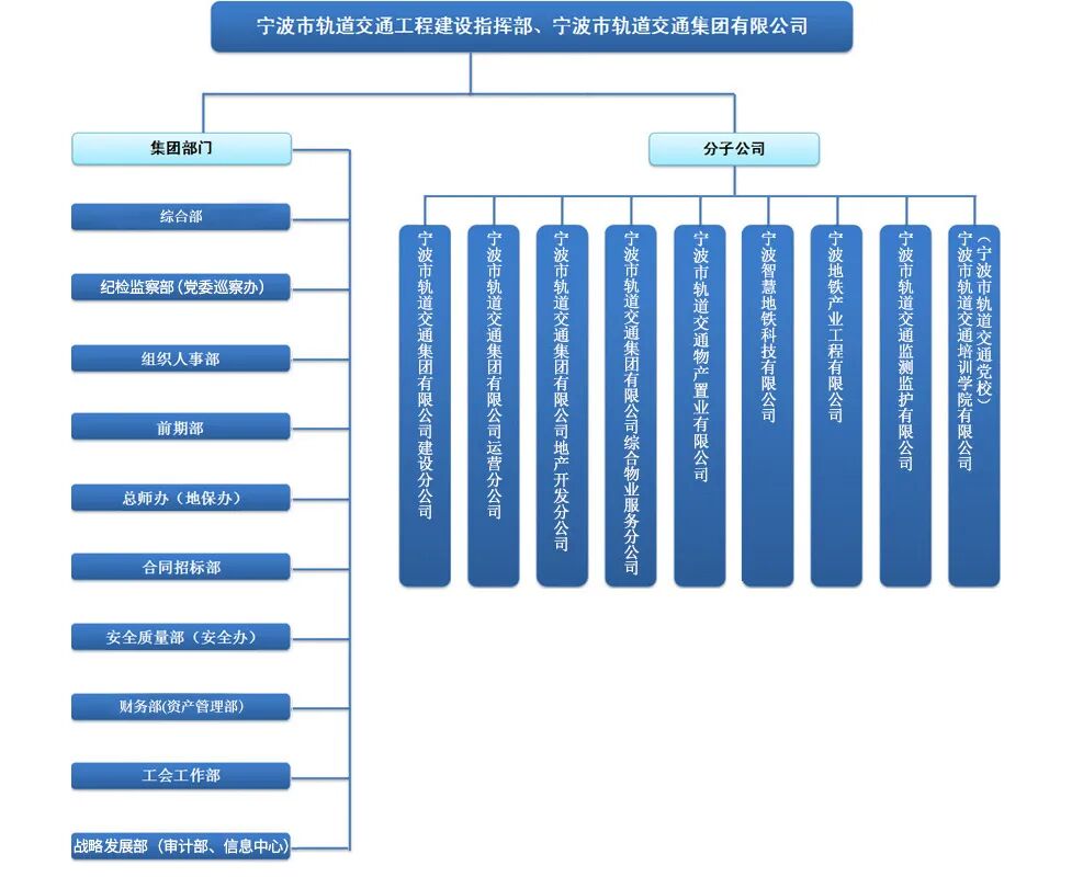 宁波市轨道交通工作机构包括宁波市轨道交通工程建设指挥部和宁波市轨道交通集团有限公司,二者统分结合、统筹运作。指挥部于2007年底正式成立,为市政府直属正局级事业单位,集团公司于2006年底注册成立。集团公司下设宁波市轨道交通集团有限公司建设分公司、宁波市轨道交通集团有限公司运营分公司、宁波市轨道交通集团有限公司地产开发分公司、宁波市轨道交通物产置业有限公司、宁波智慧地铁科技有限公司、宁波市轨道交通集团有限公司综合物业服务分公司、宁波市轨道交通监测监护公司、宁波地铁产业工程有限公司、宁波市轨道交通培训学院有限公司等九家分子公司。