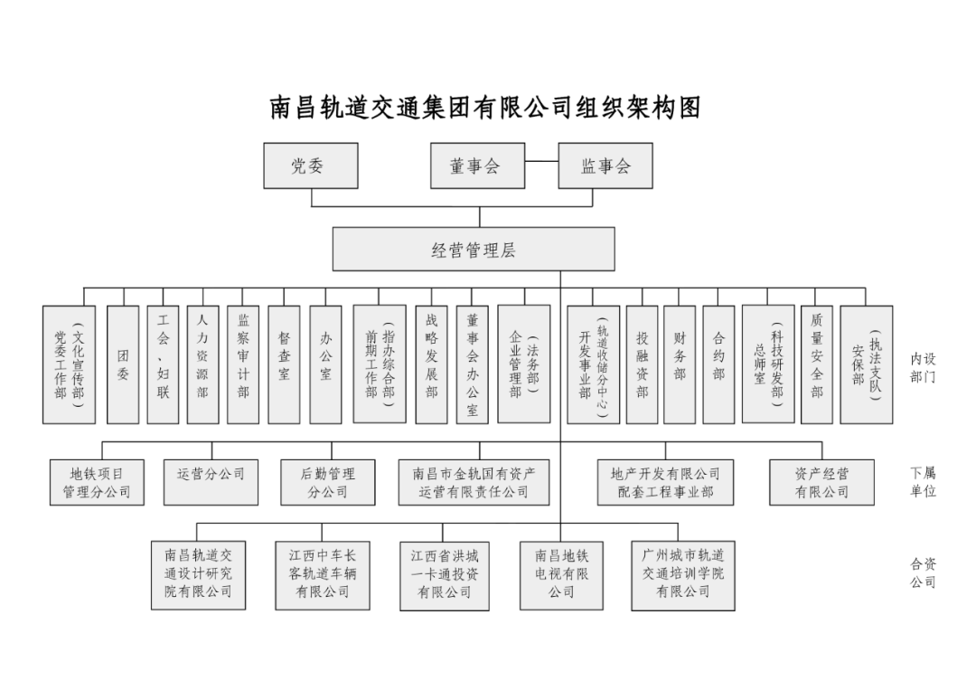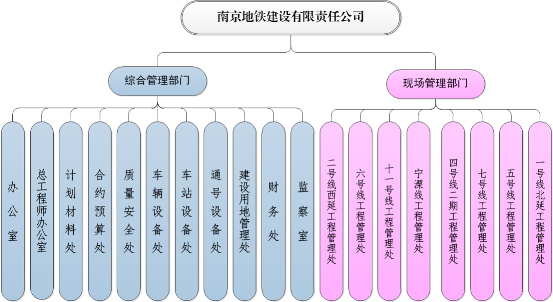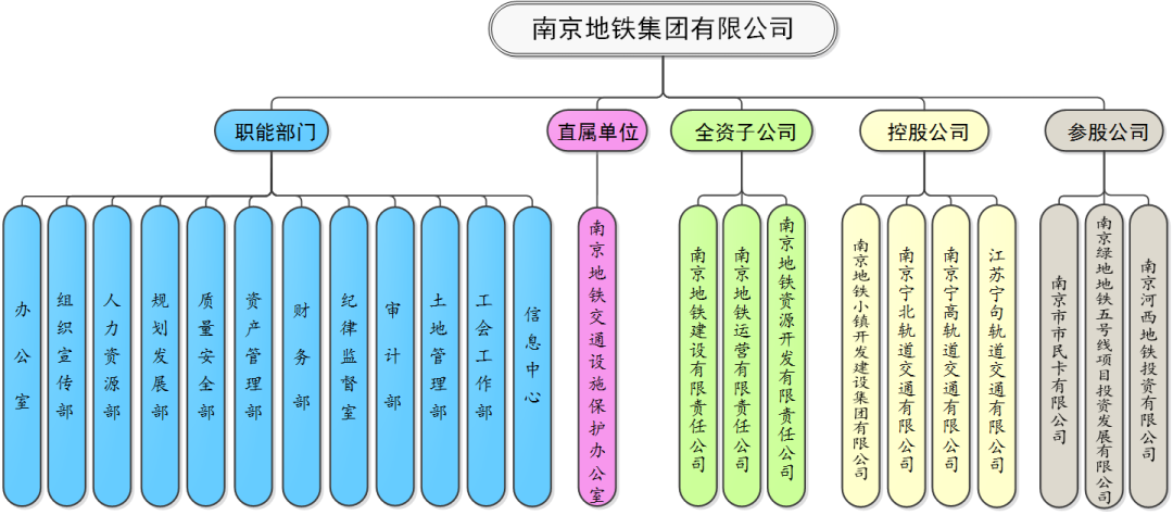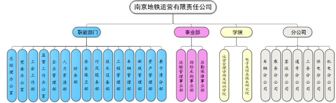 南京地铁集团有限公司内设12个部门包括办公室、组织宣传部、人力资源部、规划发展部、质量安全部、资产管理部、财务部、纪律监督室、审计部、土地管理部、工会工作部、信息中心,1个直属单位:南京地铁交通设施保护办公室。
