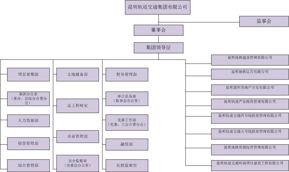 昆明轨道交通集团有限公司原为昆明轨道交通有限公司,于2008年12月由昆明市人民政府批准成立,2009年3月正式组建,2013年10月成立集团公司并正式挂牌运营。昆明轨道交通集团有限公司为市属国有独资公司,注册资本金50亿元人民币,负责城市轨道交通项目投资、融资、建设、运营、管理和资源开发。昆明轨道交通集团有限公司设董事会及监事会,集团总部设19个职能部门,7个全资(控股)子公司,拥有员工5000余人(截至2020年2月)的大中型国有企业。