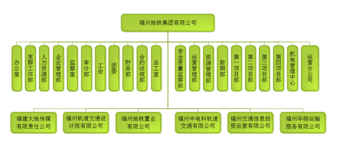 福州地铁集团有限公司成立于2009年(原名福州市城市地铁有限责任公司),是福州市国资委直接管理的国有大型企业,。集团下设20个部室以及1个运营分公司,下属1个全资公司(福州地铁置业有限公司)、2个控股公司(福州轨道交通设计院有限公司、福建大地传媒有限公司),3个参股公司(福州中电科轨道交通有限公司、福州交通信息投资运营有限公司和福州华榕运输服务有限公司)。公司注册资本为13.914亿元,总资产约505亿元,员工超4000人。