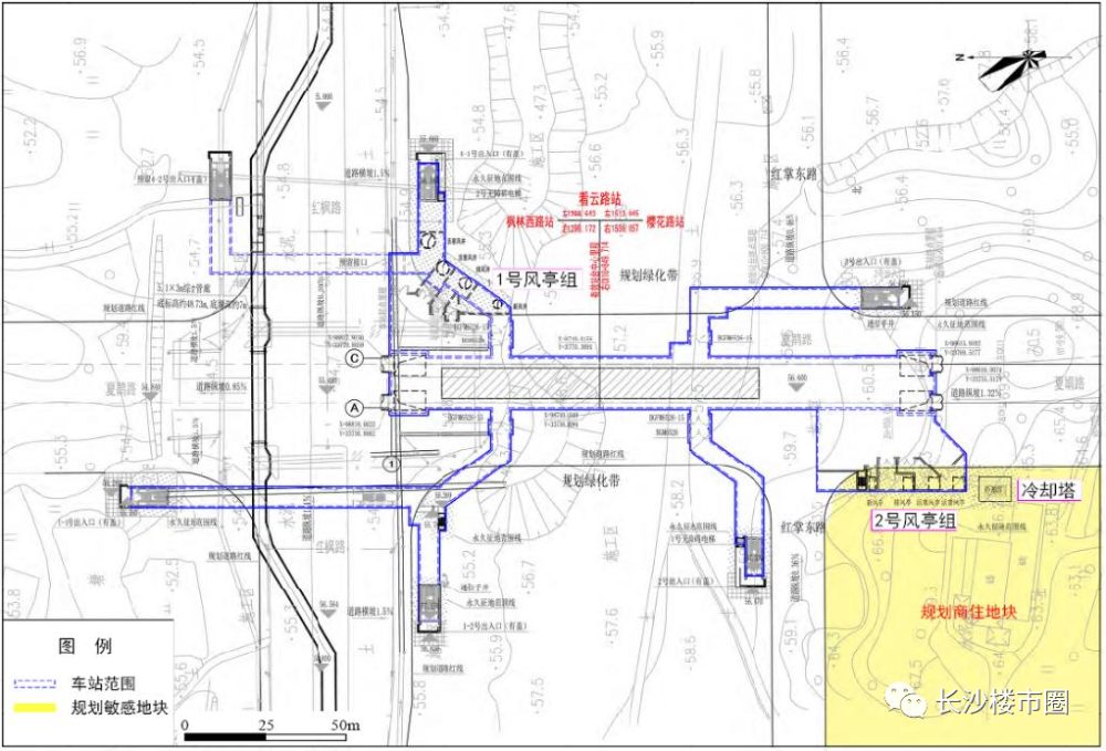 映日路站位于映日落与梧桐路交叉口西北侧地块内,站点跨度较大。