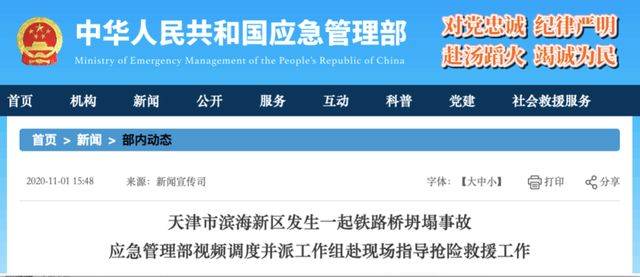 2020年11月1日9时许,天津市滨海新区天津港散货物流加工区一跨河铁路桥在维修施工过程中发生坍塌,部分施工人员被压。当地消防救援力量192人携带10条搜救犬赶赴现场救援。