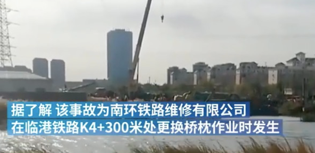 2020年11月1日9时许,天津南环铁路维修有限责任公司在南环铁路桥梁维修过程中发生坍塌事故。事故发生在临港铁路K4+300米处。记者在现场看到,工地上一辆挖掘机翻倒。现场一名工程施工人员介绍说,铁路桥梁长30余米。事故发生时,施工人员在进行桥梁枕木维修作业。
