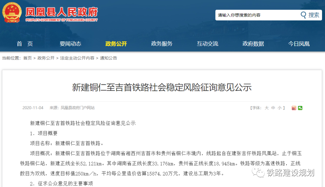 11月4日,《新建铜仁至吉首铁路社会稳定风险征询意见公示》凤凰县人民政府网站正式发布。