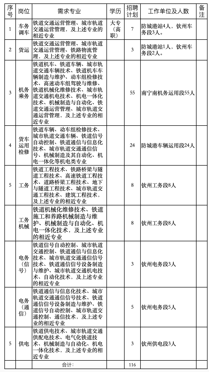 (1)应聘序号为1-6的岗位:要求铁路主专业毕业生在校期间所学专业方向为铁路专业方向或所学主要课程中包含铁路专业课程,相近专业高质量院校毕业生优先;