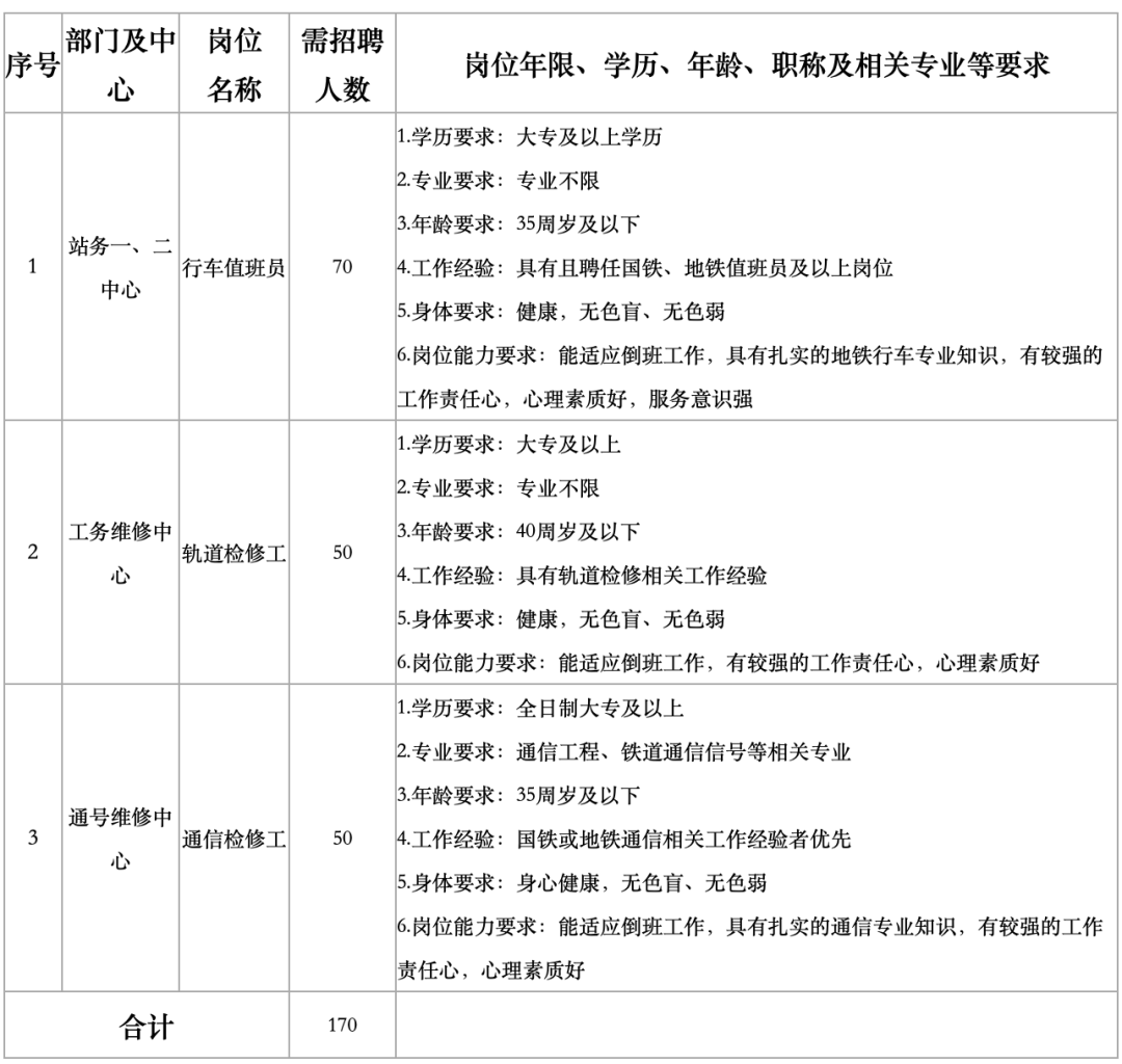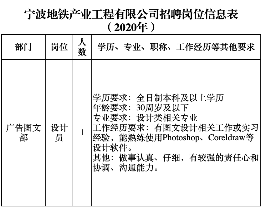 宁波地铁产业工程有限公司为宁波市轨道交通集团有限公司全资子公司,主要职责包括资产管理、工程施工、地铁出入口接入服务、材料物资经营、对外产业投资等。因工作需要,特招聘以下岗位人员(详见附件1)。