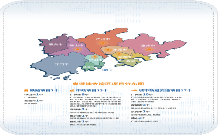 广东公司成立以来,以绩效管理为核心,以企业文化为引领,先后参建和完成了广珠城际轨道交通、东莞至惠州城际轨道交通、广州至佛山地铁、广州地铁5号线、9号线、8号线、11号线、13号线、14号线、21号线、广州地铁维修标、深圳地铁、东莞地铁、广州南沙开发区中船造船基地工程、广州南洲路排水等地铁、市政、城市轨道交通工程和神华集团准池铁路、沪昆客专杭长段、云南段、渝黔客专、郑徐客专、昌赣客专、赣深客专等铁路工程建设,安全、优质、按期完成和顺利推进了各项工程建设,赢得了广州地铁总公司、神华准池铁路公司等多家建设单位的肯定、赞誉和表彰,为社会和国家基础设施建设作出了重要贡献。 千里之行,始于足下。广东公司确定了“依托珠三角,扎根珠三角,建设一流企业,打造珠三角地区知名品牌”的发展目标,坚持“知行合一、永争第一”理念,发扬“勇于跨越、追求卓越”的中国中铁精神,攻坚克难,彰显新一代铁路人的风采。
