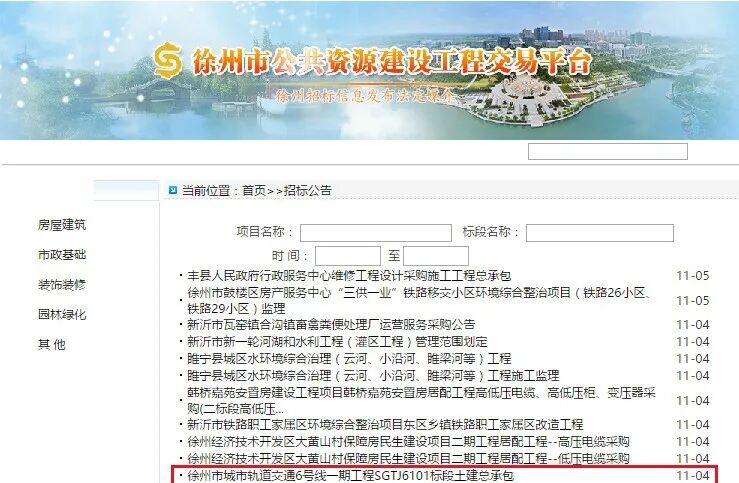 近日,徐州市城市轨道交通6号线一期工程可行性研究报告正式获得江苏省发改委批复,由此不少人最关心的是什么时候才能动工。最新消息,根据徐州市公共资源建设工程交易平台官网显示,地铁6号线一期工程开始土建总承包的招标工程。