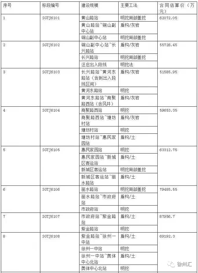 标段划分表:本批次招标共分为12个标段,详细情况见下表:注:申请人(含联合体牵头人及其成员)在本批次标段中,最多只能选取3个标段申请资格预审,超过3个标段时,按照标段编号的数值由小到大选取前3个标段进行资格预审,但最多获得一个标段的中标资格。1、车辆段(含土建工程、二次结构、装饰装修、常规机电安装、弱电系统、室外道路、市政管线、景观绿化等)土建工程;3、与已建或规划市政项目配套或连接的永久性市政接驳工程;4、与土建相关的其他工程,如杂散电流、接地网、白蚁防治工程等。根据官网消息,按照地铁6号线一期工筹计划,地铁6号线一期将于2020年12月开工建设,2025年9月建成通车。除此之外,地铁2号线一期工程也将在11月28日试运行,预计明年年底,徐州市轨道交通将有望形成“三线运营,三线在建”的局面。