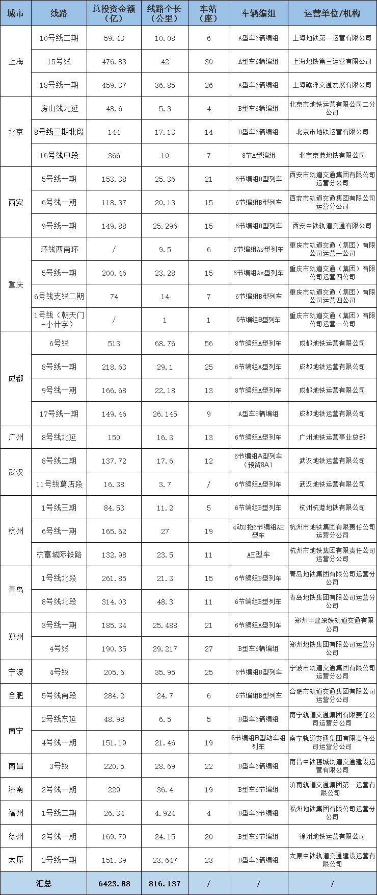 据统计2020年底预计有18座城市,预计36条线路开通运营,总金额达到6423.88亿元,线路全长816.137公里。