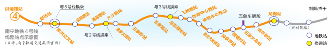 10月28日,南宁地铁4号线一期首通段(洪运路站至楞塘村站)工程初步验收顺利通过,能够满足开通试运营的要求,预计11月23日开通运营!项目概况:4号线是南宁市轨道交通线网中东西向的骨干线,线路西起洪运路站,经洪历路、那洪大道、五象大道、联合路到达龙岗站,途经大沙田成熟区、五象新区、五象火车站等主要区域,线路全长21.46公里。4号线一期工程全线设一段一场,西侧为沙井停车场,东侧为五象车辆段,线路全长21.4公里,均为地下线,共设19座车站,其中换乘站3座。