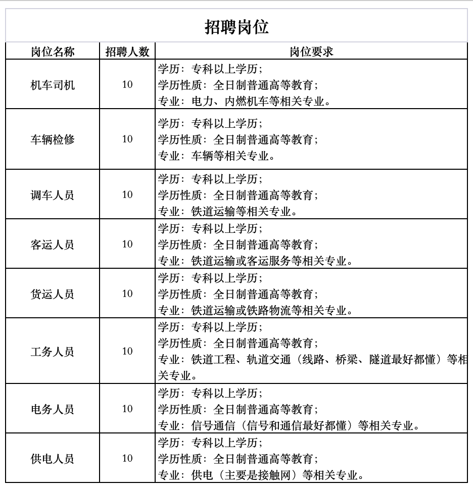 1.2021年应届毕业生,全日制普通高等院校专科及以上学历,铁路专业方向或所学主要课程中包括铁路专业课程,所学专业与招生岗位需求一致,符合招聘岗位任职要求。
