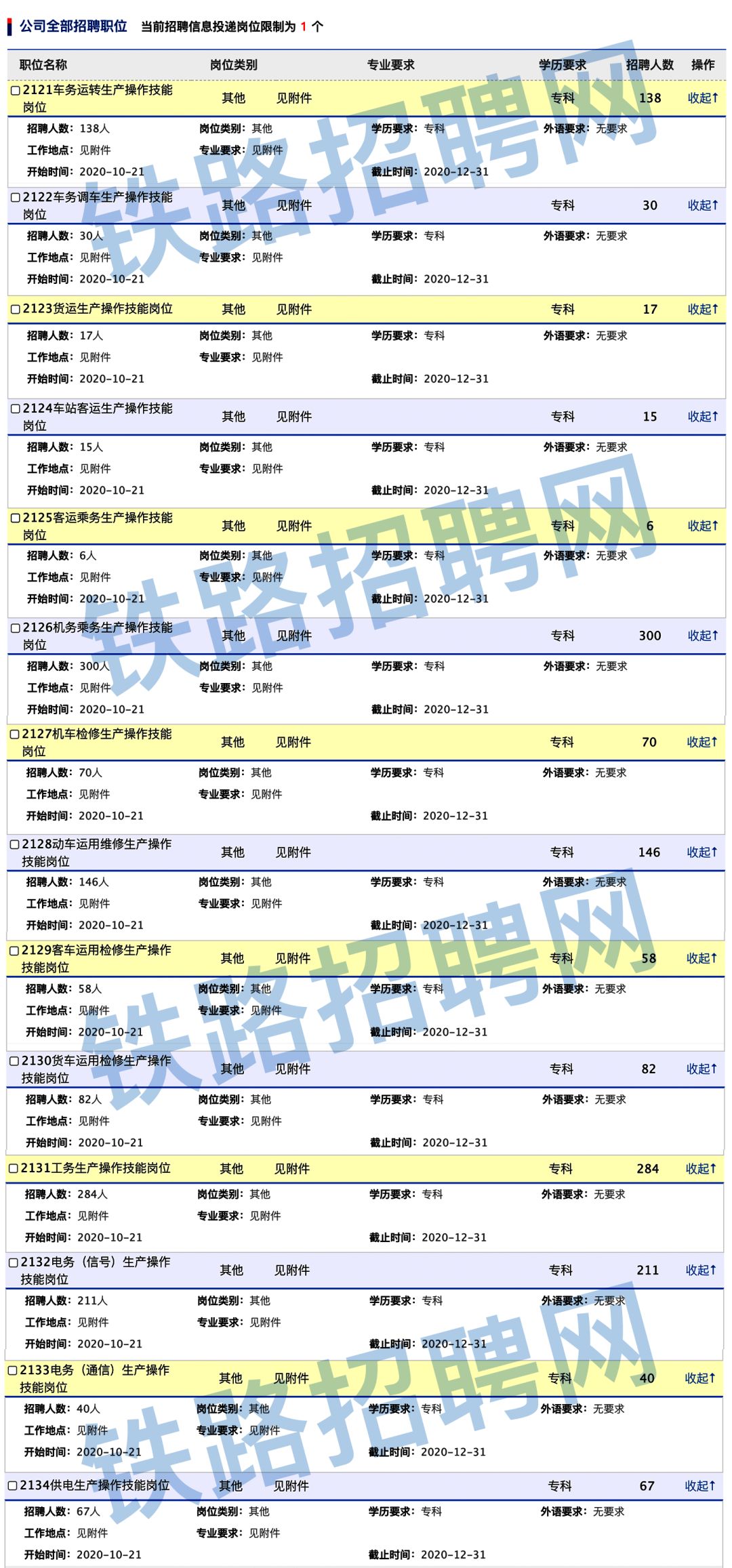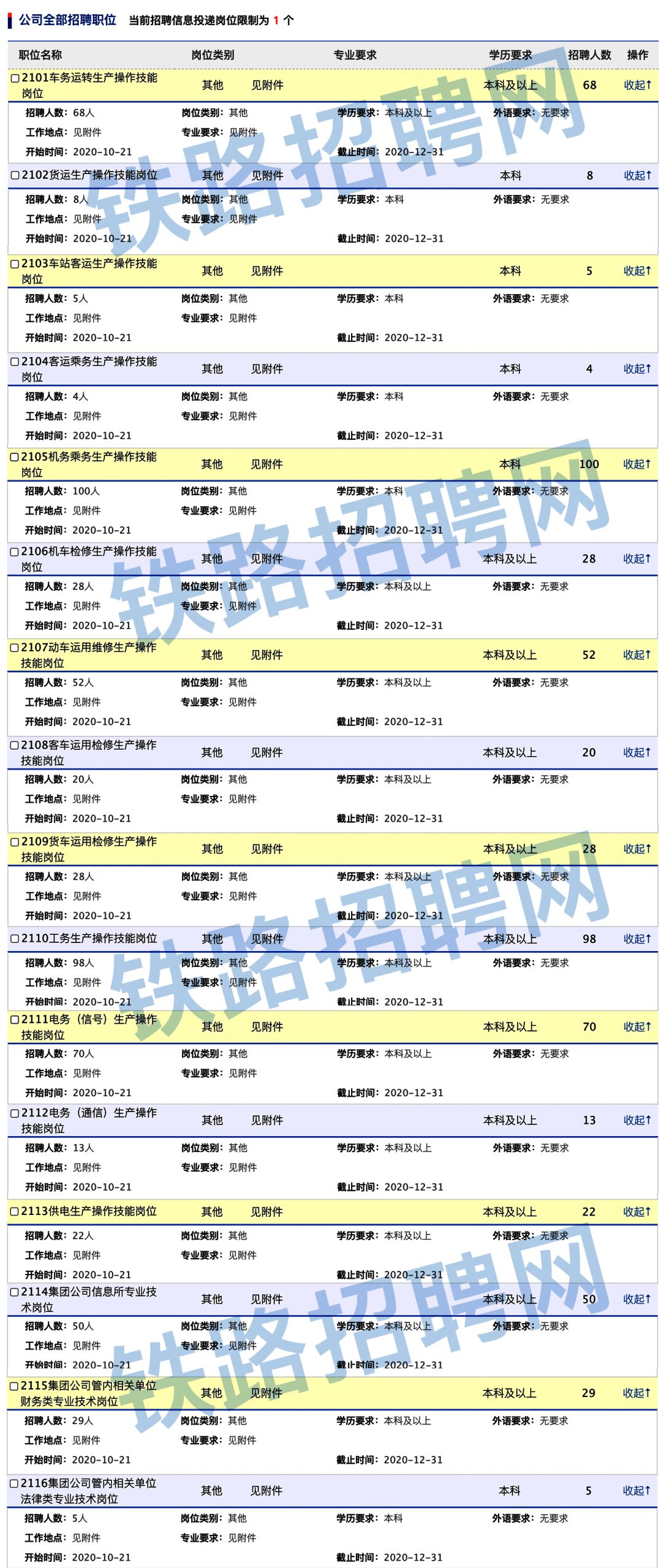 本次招聘岗位均为铁路运输生产一线操作技能岗位,具体招聘岗位、专业要求、工作单位及招聘人数详见附件。