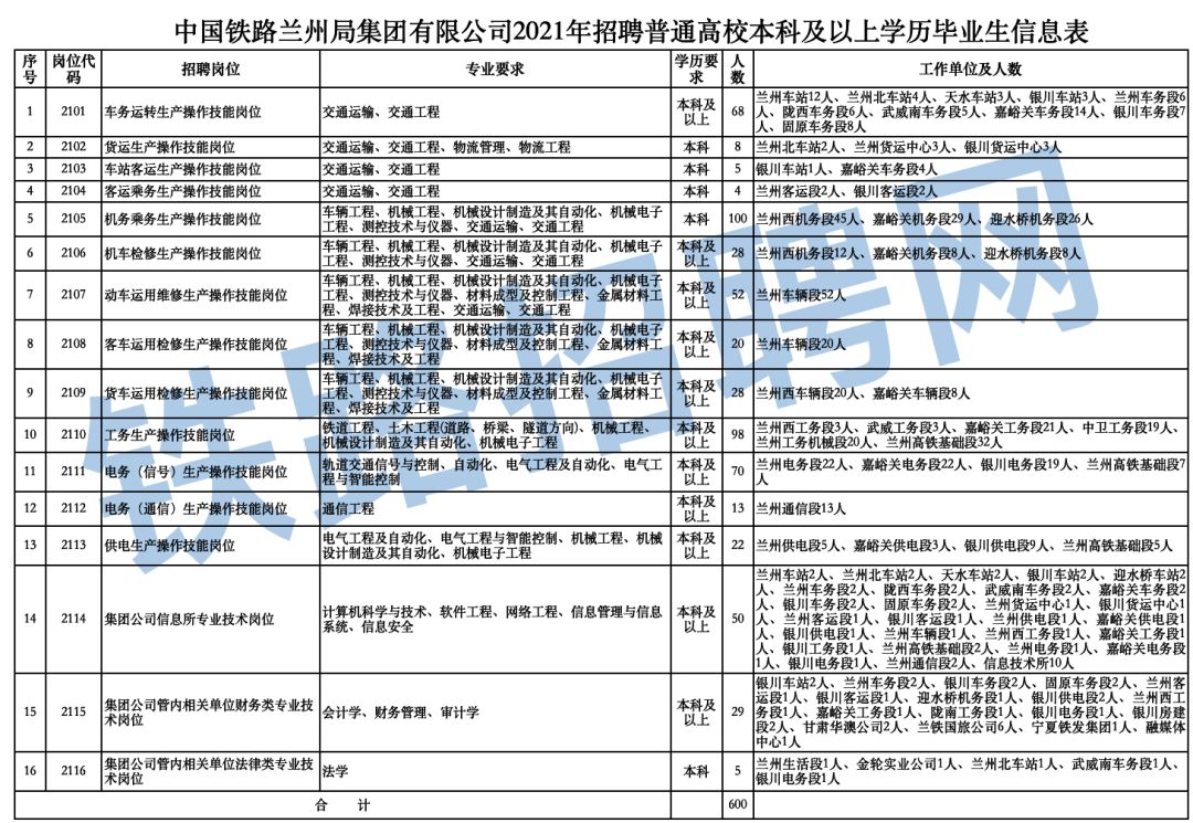 1、600人!中国铁路兰州局集团有限公司2021年招聘普通⾼校毕业⽣公告(⼀)