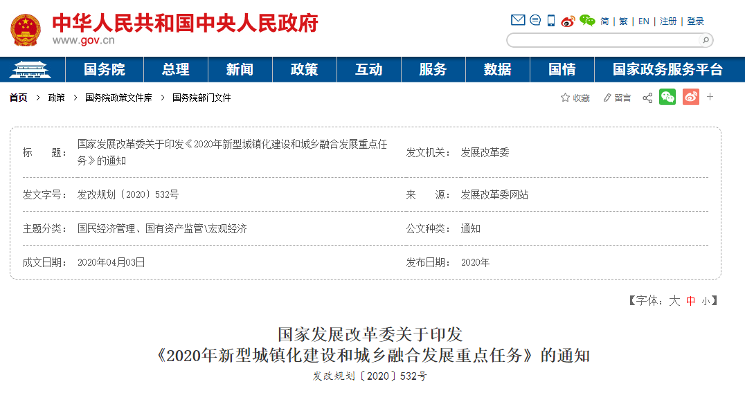 1、建设规划层面,支持重点都市圈编制多层次轨道交通国家发改委4月9日消息,近日,国家发改委印发《2020年新型城镇化建设和城乡融合发展重点任务》,大力推进都市圈同城化建设。建立中心城市牵头的协调推进机制,支持南京、西安、福州等都市圈编制实施发展规划。以轨道交通为重点健全都市圈交通基础设施,有序规划建设城际铁路和市域(郊)铁路,推进中心城市轨道交通向周边城镇合理延伸,实施“断头路”畅通工程和“瓶颈路”拓宽工程。支持重点都市圈编制多层次轨道交通规划。2、探索建立全国性建设用地、补充耕地指标跨区域交易机制《2020年新型城镇化建设和城乡融合发展重点任务》提出,改革建设用地计划管理方式。鼓励盘活低效存量建设用地,控制人均城市建设用地面积。修改土地管理法实施条例并完善配套制度,分步实现城乡建设用地指标使用更多由省级政府负责,将由国务院行使的农用地转为建设用地审批权以及永久基本农田、永久基本农田以外的耕地超过35公顷、其他土地超过70公顷的土地征收审批权,授权省级政府或委托试点地区的省级政府实施。探索建立全国性的建设用地、补充耕地指标跨区域交易机制。《2020年新型城镇化建设和城乡融合发展重点任务》提出,改革城市投融资机制。在防范化解地方政府债务风险、合理处置存量债务的前提下,完善与新型城镇化建设相匹配的投融资工具。支持符合条件企业发行企业债券,用于新型城镇化建设项目、城乡融合典型项目、特色小镇和特色小城镇建设项目等。鼓励开发性政策性金融机构按照市场化原则和职能定位,对投资运营上述项目的企业进行综合授信,加大中长期贷款投放规模和力度。统筹新生城市培育和收缩型城市瘦身强体,按程序推进具备条件的非县级政府驻地特大镇设市,有序推进“县改市”“县改区”“市改区”,稳妥调减收缩型城市市辖区,审慎研究调整收缩型县(市)。全面完成各省(区、市)设镇设街道标准制定工作,合理推进“乡改镇”“乡(镇)改街道”和乡镇撤并。推动超大、特大城市调整完善积分落户政策,探索推动在长三角、珠三角等城市群率先实现户籍准入年限同城化累计互认。放开放宽除个别超大城市外的城市落户限制。完善城市数字化管理平台和感知系统,打通社区末端、织密数据网格,整合卫生健康、公共安全、应急管理、交通运输等领域信息系统和数据资源,深化政务服务“一网通办”、城市运行“一网统管”,支撑城市健康高效运行和突发事件快速智能响应。