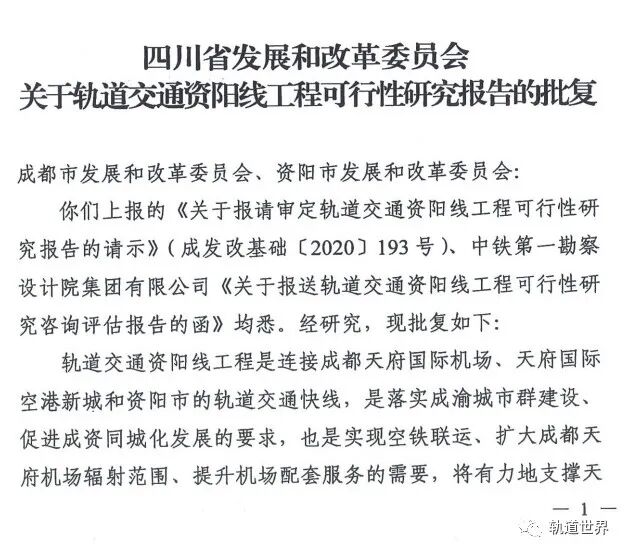 轨道交通资阳线工程施工总承包项目(项目名称)已由四川省发改委(项目审批、核准或备案机关名称)以川发改基础[2020]417号(批文名称及编号)批准建设。