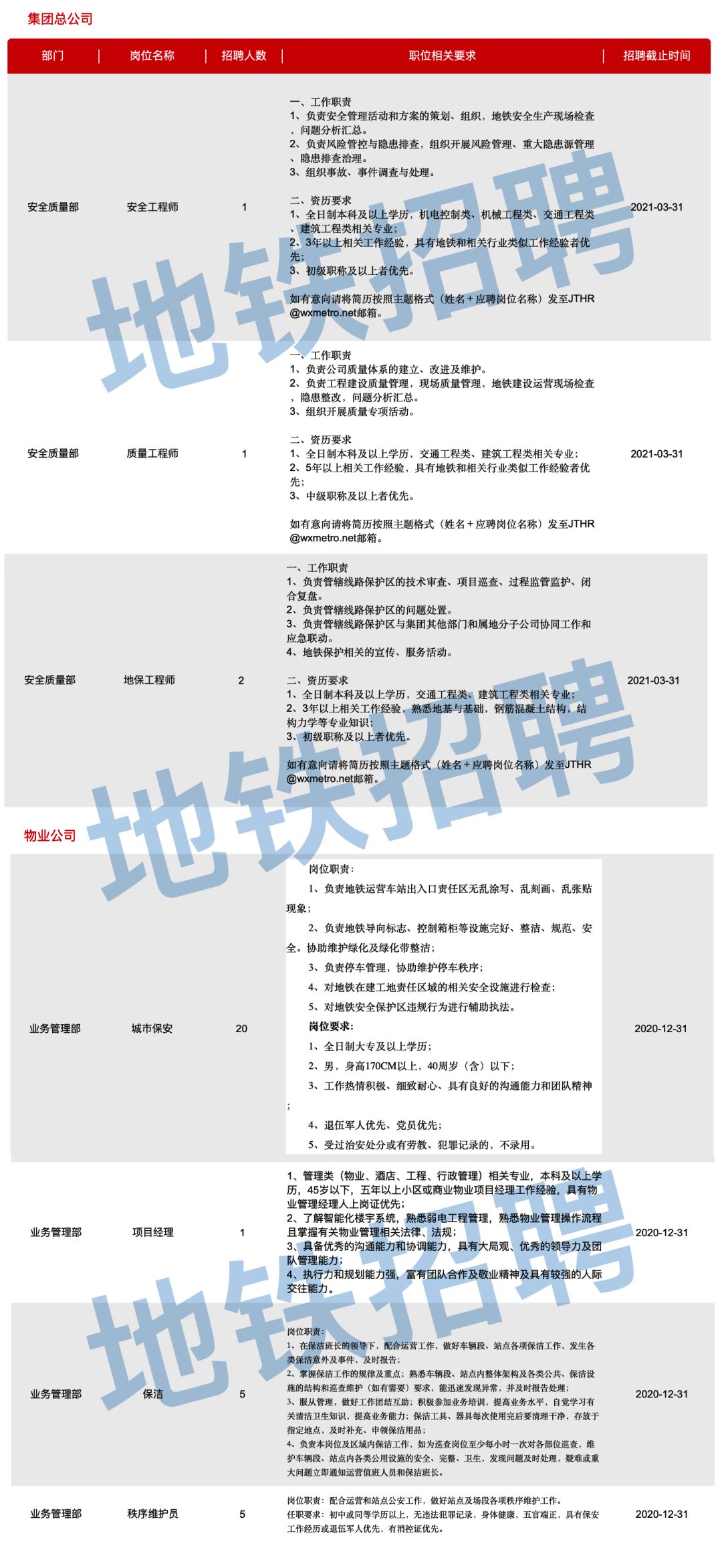 无锡地铁集团有限公司前身为无锡市轨道交通发展有限公司,成立于2008年11月,与无锡市轨道交通规划建设领导小组(指挥部)办公室“两块牌子、一套班子”合署 办公模式。2012年7月,经无锡市人民政府批准,更名为无锡地铁集团有限公司。主要从事城市地铁及其周边资源综合开发利用与附属工程的投 资、融资、建设、运营和管理等工作;承担政府下达的其它城市基础设施建设和运营管理职能。 无锡地铁将秉承“建一流地铁 创运营典范”的时代使命,致力于打造极具无锡特色的“安全地铁”、“品质地铁”和“幸福地铁”。 社会招聘岗位: