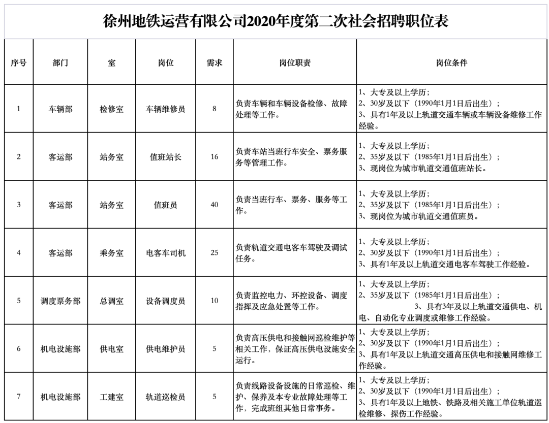 2、109人!徐州地铁运营有限公司2020年度第二次社会招聘公告