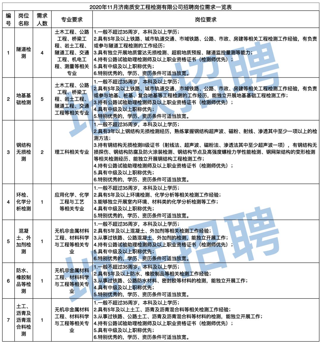 济南质安工程检测有限公司是济南轨道交通集团有限公司的全资子公司,主要从事建筑工程、市政公用工程、桥梁隧道工程等的检测技术服务业务。根据公司业务发展需要,现诚邀有相关工作经验的有识之士加盟,具体如下: