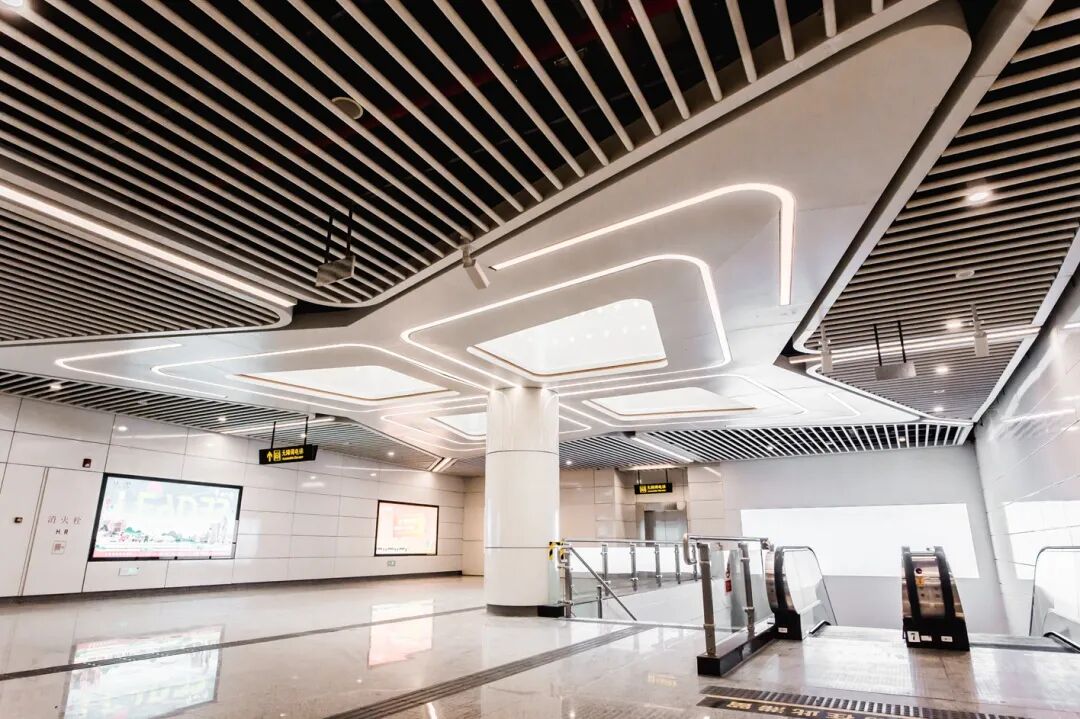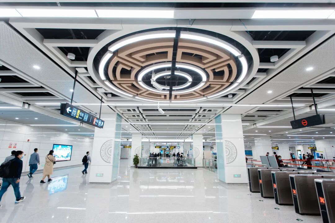南宁市轨道交通4号线一期工程,让城市再添通途的同时,也展现南宁“一带一路”门户的商贸文化特色,是人们为之期待的“城市丝路”,也是南宁市轨道交通线网体系实施的第四条线路,线路贯穿南宁邕江以南,位于五象新区的东西向骨干线,以“丝路新篇”为主题,采用海蓝色作为装饰颜色;天花两侧造型形似跨海大桥又似船桨,中心天花采用圆通拼成帆的形态,墙面上部有浪花带,与柱面上部的海面行驶船舶剪影及线路图相映衬,象征一艘行驶在海上丝路的商船,正在扬帆起航。