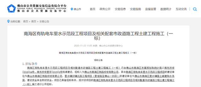 11月23日,佛山市公共资源交易中心就南海区有轨电车里水示范段连发3份施工招标,涉及南海区有轨电车里水示范段工程项目及相关配套市政道路工程土建工程施工。