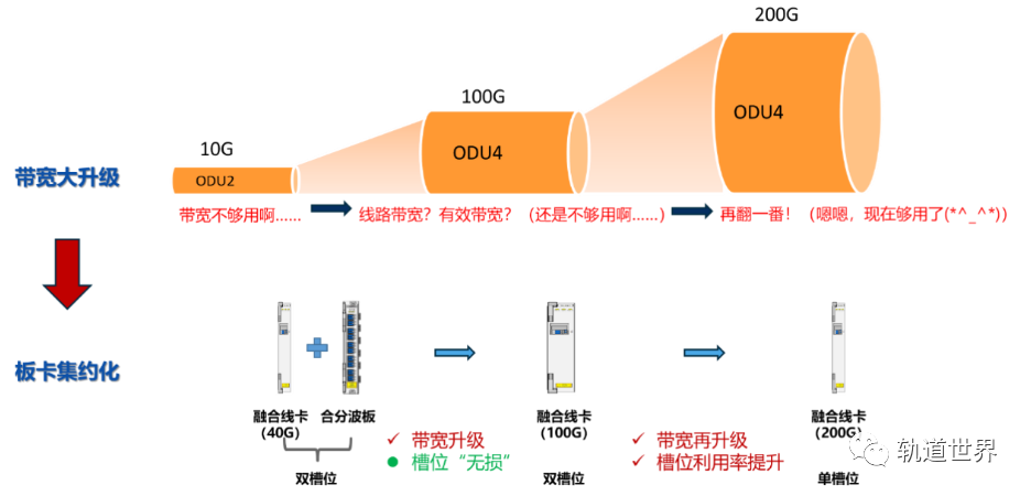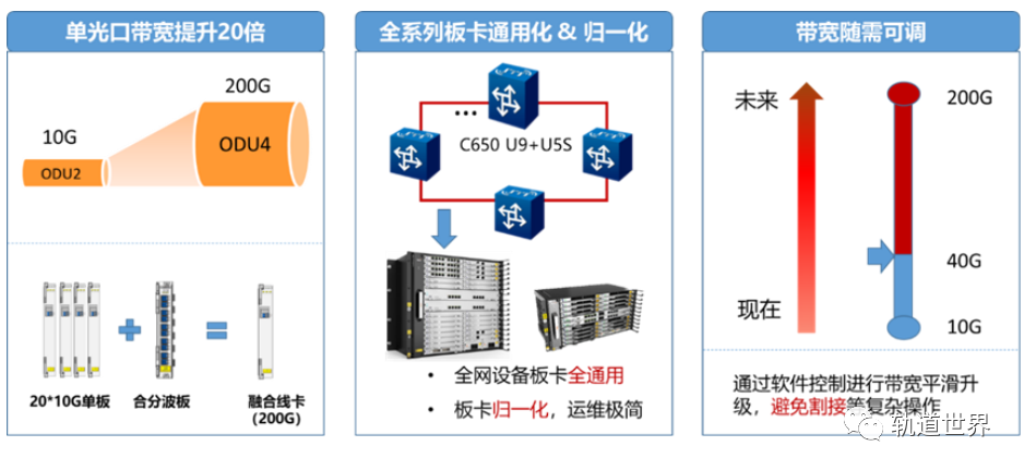 遍观轨道交通传输系统发展历史,由于各系统业务的不断数字化、IP化、云化,大带宽、全业务也便成为客户对于传输系统形态最核心的诉求。因此,融合承载型OTN技术,就成为最契合客户需求的选择。融合承载,意味着该系统可以接入SDH、IP等地铁行业需要的所有业务类型;OTN技术,意味着超过100G带宽的线路传输成为可能。同时,不断缩小的封装颗粒(ODUk→OSU),又使得业务管道基于物理隔离的“柔性”传输成为现实。针对轨道客户的不同需求,烽火轨道交通传输系统在细节处也力求做到极致。在线路侧,采用200G单板实现全网大带宽组网,同时,进一步优化板卡结构设计,将板卡尺寸控制在单槽位大小,提升槽位利用率;在业务侧,将所有IP化业务归一至同一板卡承载(即FE/GE/10GE 光/电),减少了板卡需求种类,为客户部署及日常运维均提供便利。