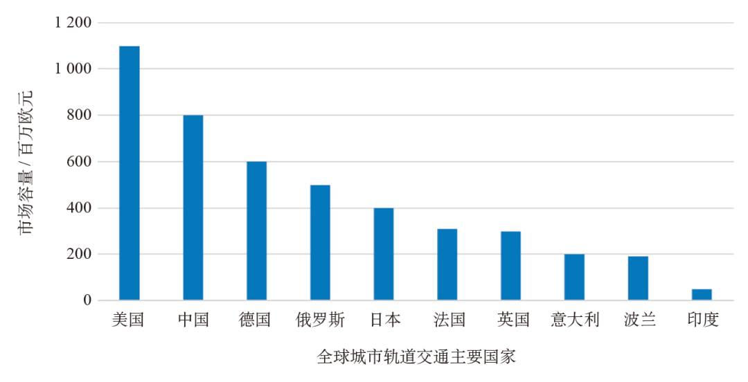 在城市轨道交通方面,2018年美国运营维保后市场容量居世界第一;中国由于近年来城市轨道交通得到快速发展,市场容量达到世界第二,如图2所示。