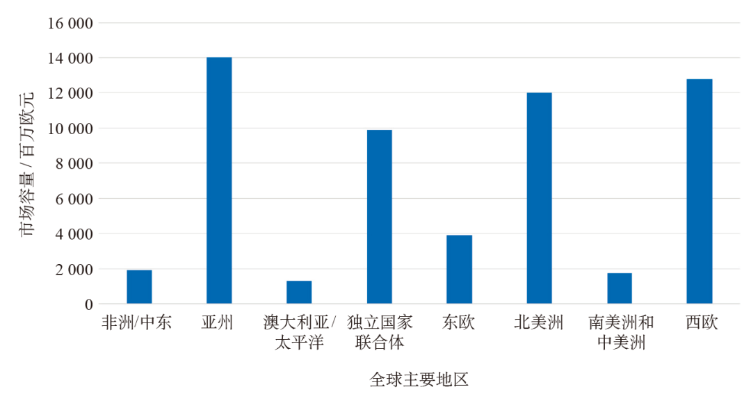 根据世界铁路行业著名咨询公司德国SCI Verkehr公司于2019年发布的研究报告,2018年,全球轨道交通运营维保后市场规模近540亿欧元(其中城市轨道交通近60亿欧元),比车辆制造市场高出6%的份额,并且预计至2023年将以平均每年3.2%的速率继续增长。依托于轨道交通的快速建设,亚洲目前已经超过西欧,拥有全球最大的轨道交通运营维保后市场(包括大铁和城市轨道交通),并将在未来继续充当全球轨道交通运营维保后市场进一步增长的引擎,如图1所示。