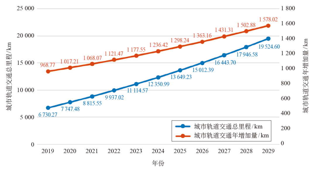 城市轨道交通运营维保后市场与运营里程正相关,与城市轨道交通的重置成本成一定的比例关系。截至2019年底,我国城市轨道交通运营里程为6730.27km。根据中国城市轨道交通协会的预测,未来10年全国城市轨道交通总运营里程将持续增加,每年新开通线路里程也呈逐年增加趋势。以每年新开通线路同比上年增长约5%计算,预测2029年将新开通1578.02 km,总运营里程将达到约1.95万km,为2019年运营里程的2.9倍,如图3所示。