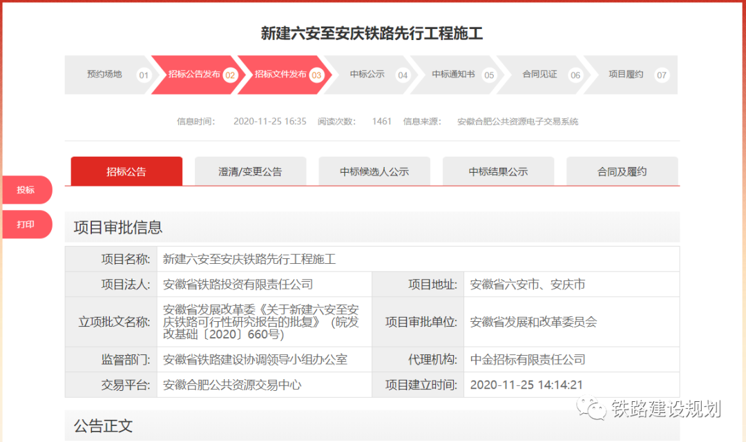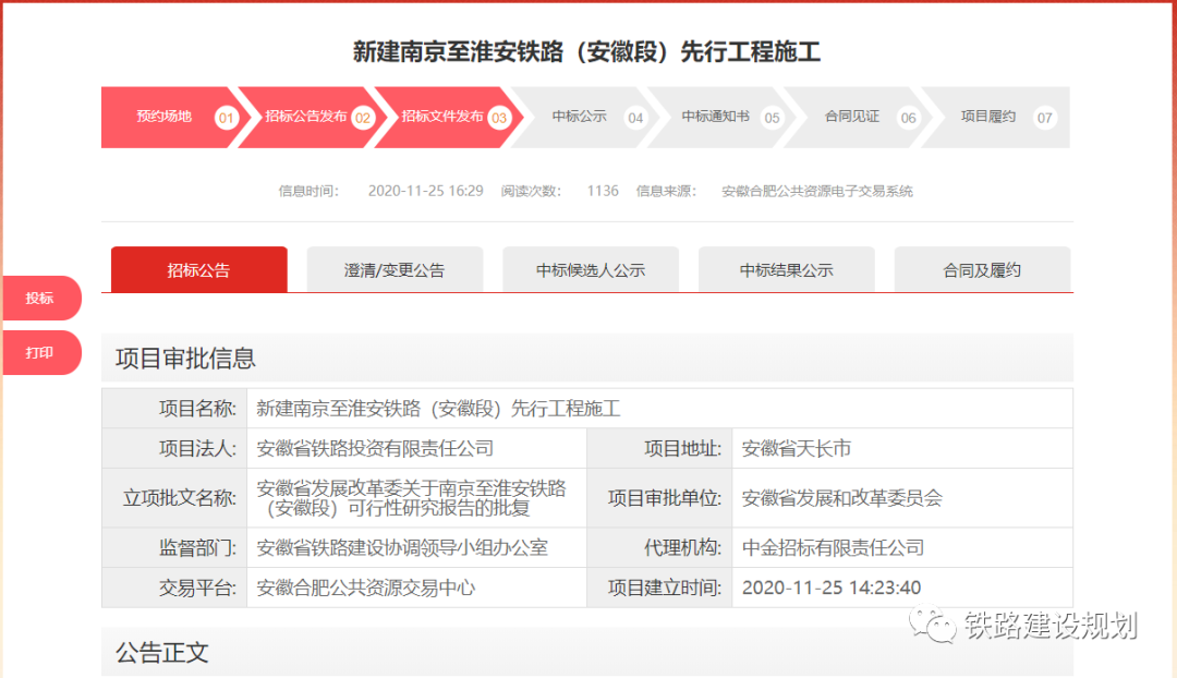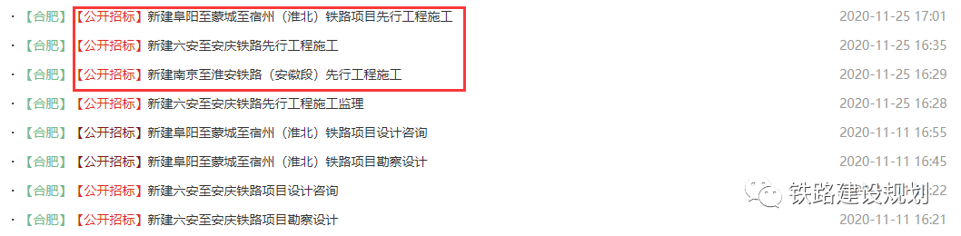 11月25日,安徽省铁路投资有限责任公司相继发布了《新建南京至淮安铁路(安徽段)先行工程施工招标公告》、《新建六安至安庆铁路先行工程施工招标公告》以及《新建阜阳至蒙城至宿州(淮北)铁路项目先行工程施工招标公告》。标志着这三条城际铁路先期工程将于12月底正式开工。