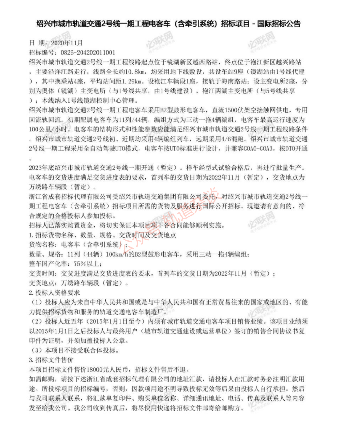 44辆!绍兴城市轨道交通2号线一期电客车(含牵引系统)招标