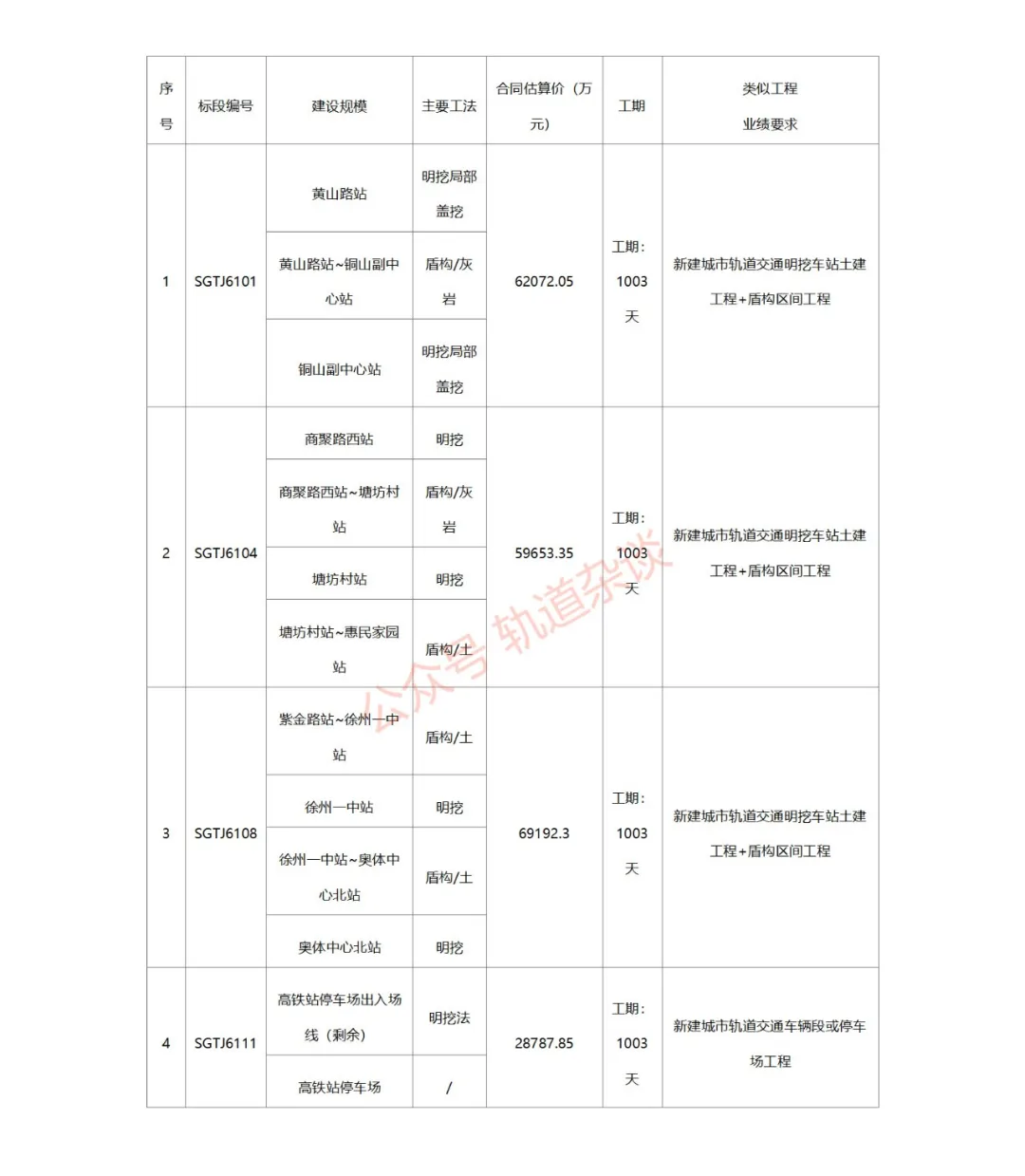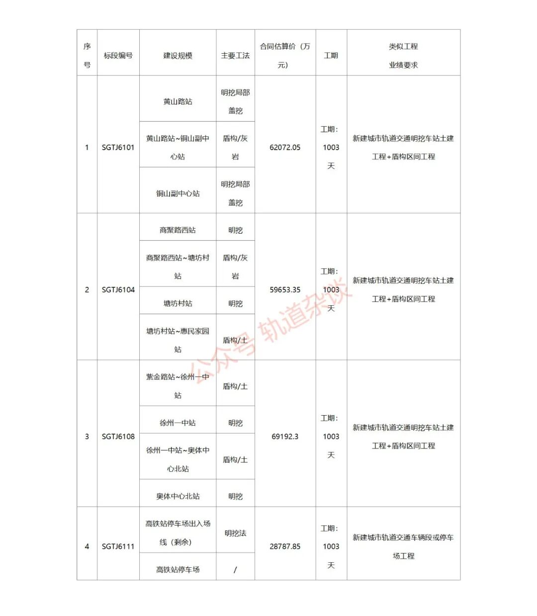 本招标项目徐州市城市轨道交通6号线一期工程已由江苏省发展和改革委员会以苏发改基础发[2020]1163号批准建设,项目业主为徐州地铁集团有限公司,建设资金为建设单位多渠道筹集解决,项目出资比例为100%。项目已具备招标条件,现对该项目徐州市城市轨道交通6号线一期工程SGTJ6101标段土建总承包的施工进行公开招标,特邀请有兴趣的潜在投标人参加投标。徐州市城市轨道交通6号线一期工程为一条反“L”型轨道交通线路。工程起点为黄山路与湘江路交叉口的黄山路站,途经铜山区、云龙区与开发区,联系了铜山新区、新城区及高铁东站,串联铜山新区中心、新城行政商务中心、新城区客运站、高铁站等大型客流集散点。线路主要沿湘江路、利民路、汉风路、云台路敷设,终止于徐州东站东广场。6号线一期工程线路全长约22.912km,平均站间距1.496km,最小站间距为0.809km(徐州一中站至奥体中心北站),最大站间距为3.068km(京沪高铁西站至大湖北站),全部为地下线,共设站16座。其中换乘站6座,分别与3号线在铜山副中心站换乘;与规划S2线在新城区客运站换乘;与2号线在市政府站换乘;与规划5号线在紫金路站换乘;与规划7号线在京沪高铁西站换乘;与1号线在徐州东站换乘。本工程新建汪庄车辆段和高铁站停车场各1座。赵武线网控制中心(4、5、6、7、S2、S3线共用)。新建京沪高铁西主变1座(6、7号线共用),共享铜山副中心主变(3、6号线共用)。本批次招标共分为12个标段(本次资格后审为其中4个标段),本公告为SGTJ6101、04、08、11标段,详细情况见下表: