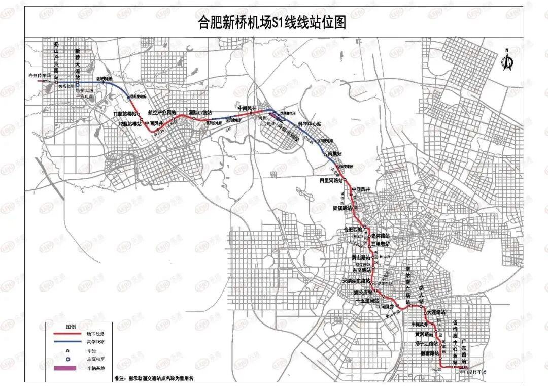 2.6 建设规模:合肥市新桥机场S1线起于蜀山产业园站,主要沿机场北路、新桥大道、新郑路、合淮路、四里河路、大杨路、黄桂路、青阳路、东至路、祁门路、十五里河、繁华大道、甘肃路、黄河路、安徽路、徽富路、中山路走行,止于广东路站,全线长约69.3km,其中高架段20.9km,过渡段2.5km,地下段45.9km,设站26座,其中高架站4座,地下站22座,换乘站12座,平均站间距2.75km。全线设1座车辆段,2座停车场,4座主变电所(其中共享其他线2座),共享方兴大道控制中心,岗集车辆段于科学中心站接轨,中山路停车场于省行政中心东站接轨,寿县停车场与蜀山产业园站接轨。