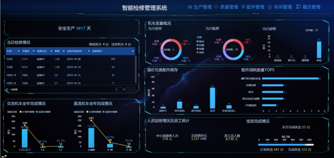 为检修业务提供全流程管理、高价互换配件及车辆全生命周期管理。结合智能列检系统、健康管理系统等数据,整合列车全生命周期数据,为精准状态修提供辅助决策依据。从而避免过度修、漏修事件发生,降低作业人员重复工作,提升工作效率。