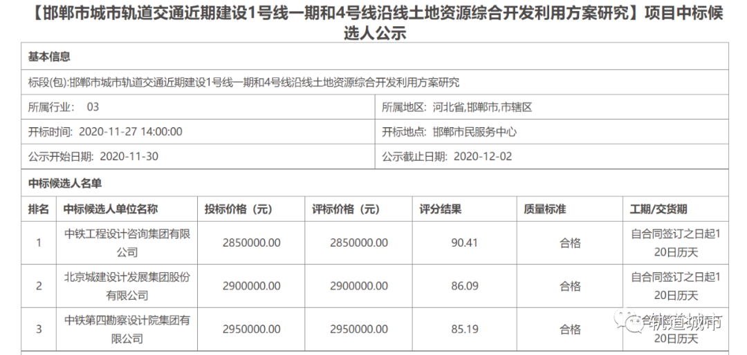 【邯郸市城市轨道交通近期建设1号线一期和4号线沿线土地资源综合开发利用方案研究】项目中标候选人公示