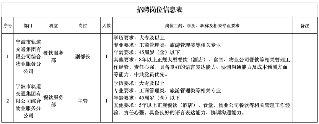 因工作需要,宁波市轨道交通集团有限公司综合物业服务分公司特招聘以下岗位人员(详见附表)。