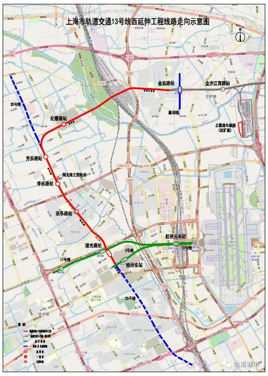 具体描述 | 13号线西延伸工程起自13号线一期工程金运路站,终于国家会展中心,途经嘉定区、闵行区和青浦区。线路全长约9.47km,线路沿诸光路—金丰路—联友路—纪宏路—金沙江西路走行,采用地下敷设方式,设车站5座,扩建北翟路停车场,设闵北路主变电所一座。 | |||||