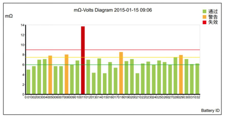 在得到内阻数据之后,工程师可以通过结果的均值来进行基准值估算,设置报警值(30%)、劣化值(50%)以及报废值(100%)。测得的数据可以通过电脑软件绘制出柱状图,直观显示电池状态。实现无纸化流程,高效且美观。