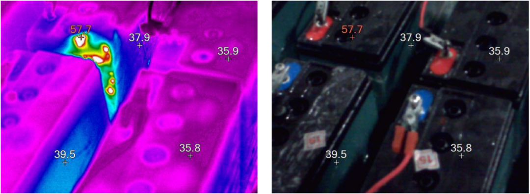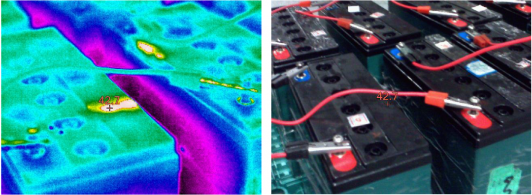 红外热像仪已经是工业用户的得力助手,不仅可以在不接触的情况下,了解电气设备的温度,更可以了解整体温度的分布。即使是在大面积扫描巡检的过程中,也可通过鲜明的色彩对比找到发热点。蓄电池的发热原因包括,充电时的纹波过高,电池漏液等等,但整体排列密集,容易被疏漏。红外热像仪可从多角度发现藏在深处的发热点,高效完成排查,及时发现隐患点。