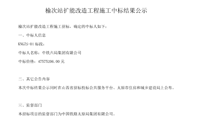 榆次站扩能改造工程施工中标结果公示