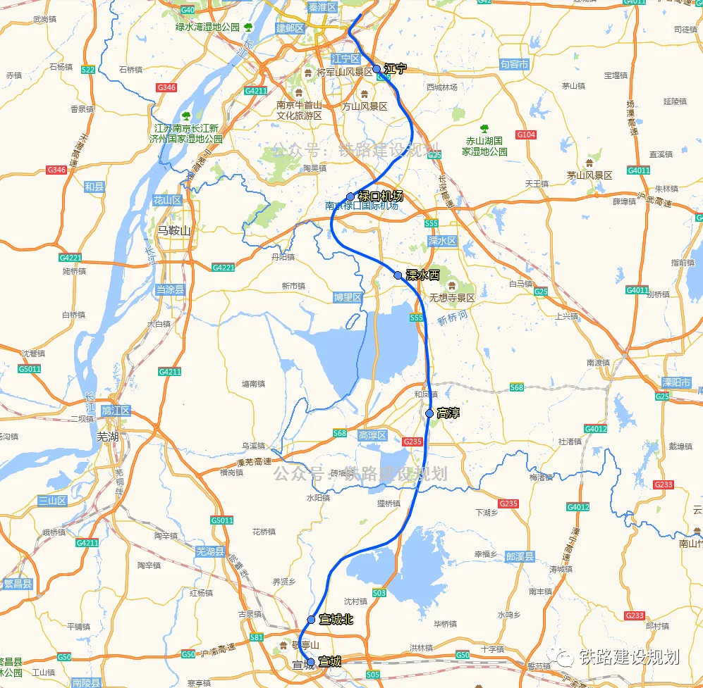 之后线路沿宁杭高铁,经江宁站东侧、句容西(联络线引入)后折向西南,与扬镇宁马城际铁路镇江至马鞍山段共通道经过禄口机场并设地下站。